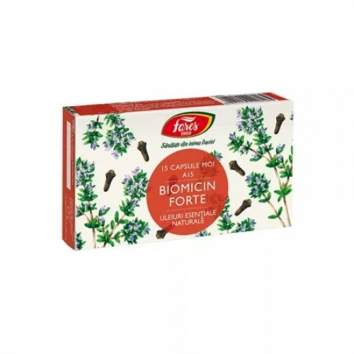 Biomicin Forte (A15), 15 capsule moi - (antibacterian natural) este un supliment alimentar grupa preparate fitoterapicepoate fi administrat la recomandarea medicului sau farmacistului; plante medicinale: extract de cimbru (thymus vulgaris).